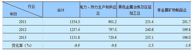 3.3.2 電力、熱力生產(chǎn)和供應(yīng)業(yè)廢氣污染物排放及處理情況 。1)電力、熱力生產(chǎn)和供應(yīng)業(yè)總體情況 2013年,電力、熱力生產(chǎn)和供應(yīng)業(yè)重點(diǎn)調(diào)查工業(yè)企業(yè)5830家,占重點(diǎn)調(diào)查工業(yè)企業(yè)的3.9%;全年工業(yè)廢氣排放量為225446.6億立方米(標(biāo)態(tài)),占重點(diǎn)調(diào)查工業(yè)企業(yè)廢氣排放量的33.7%;二氧化硫排放量為720.6萬(wàn)噸,占重點(diǎn)調(diào)查工業(yè)企業(yè)的42.7%;氮氧化物排放量為896.9萬(wàn)噸,占重點(diǎn)調(diào)查工業(yè)企業(yè)的61.2%;煙(粉)塵排放量為270.3萬(wàn)噸,占重點(diǎn)調(diào)查工業(yè)企業(yè)的26.4%。 電力、熱力生產(chǎn)和供應(yīng)業(yè)擁有廢氣治理設(shè)施23852套,占重點(diǎn)調(diào)查工業(yè)企業(yè)廢氣治理設(shè)施總數(shù)的10.2%。其中,脫硫設(shè)施5916套,占重點(diǎn)調(diào)查工業(yè)企業(yè)脫硫設(shè)施總數(shù)的27.3%;脫硝設(shè)施1168套,占重點(diǎn)調(diào)查工業(yè)企業(yè)脫硝設(shè)施總數(shù)的54.3%;除塵設(shè)施16247套,占重點(diǎn)調(diào)查工業(yè)企業(yè)除塵設(shè)施總數(shù)的9.0%。二氧化硫去除量為2620.1萬(wàn)噸,去除率為78.4%,較重點(diǎn)調(diào)查工業(yè)企業(yè)平均水平(72.2%)高出6.2個(gè)百分點(diǎn);氮氧化物去除量為301.8萬(wàn)噸,去除率為25.2%,較重點(diǎn)調(diào)查工業(yè)企業(yè)平均水平(19.2%)高出6.0個(gè)百分點(diǎn);煙(粉)塵去除量為38238.0萬(wàn)噸,去除率為99.3%,較重點(diǎn)調(diào)查工業(yè)企業(yè)平均水平(98.6%)高出0.7個(gè)百分點(diǎn)。 電力、熱力生產(chǎn)和供應(yīng)業(yè)二氧化硫排放量居全國(guó)前4位的省份依次為內(nèi)蒙古、山東、山西和貴州,其二氧化硫排放量占電力、熱力生產(chǎn)和供應(yīng)業(yè)總排放量的34.2%;氮氧化物排放量居前4位的省份依次為內(nèi)蒙古、山東、河南和江蘇,其氮氧化物排放量占電力、熱力生產(chǎn)和供應(yīng)業(yè)總排放量的30.8%;煙(粉)塵排放量居前4位的省份依次為內(nèi)蒙古、黑龍江、遼寧和山西,其煙(粉)塵排放量占電力、熱力生產(chǎn)和供應(yīng)業(yè)總排放量的39.4%。