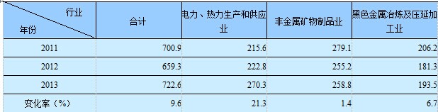 2013年,調(diào)查統(tǒng)計(jì)工業(yè)行業(yè)中,煙(粉)塵排放量位于前3位的行業(yè)依次為電力、熱力生產(chǎn)和供應(yīng)業(yè),非金屬礦物制品業(yè),黑色金屬冶煉及壓延加工業(yè),3個(gè)行業(yè)共排放煙(粉)塵722.6萬(wàn)噸,占重點(diǎn)調(diào)查工業(yè)企業(yè)煙(粉)塵排放量的70.7%。 表3-6 重點(diǎn)行業(yè)煙(粉)塵排放情況 單位:萬(wàn)噸