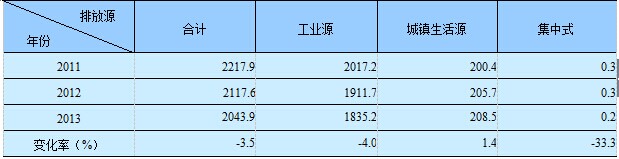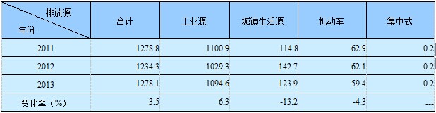 3.1 廢氣及廢氣中主要污染物排放情況 3.1.1 二氧化硫排放情況 2013年,全國(guó)工業(yè)廢氣排放量669361億立方米(標(biāo)態(tài)),比上年增加5.3%。 全國(guó)二氧化硫排放量2043.9萬(wàn)噸,比上年減少3.5%。 工業(yè)二氧化硫排放量1835.2萬(wàn)噸,比上年減少4.0%,占全國(guó)二氧化硫排放總量的89.8%。 城鎮(zhèn)生活二氧化硫排放量208.5萬(wàn)噸,比上年增加1.4%,占全國(guó)二氧化硫排放總量的10.2%。 集中式污染治理設(shè)施二氧化硫排放量0.2萬(wàn)噸。 表3-1 全國(guó)二氧化硫排放量 單位:萬(wàn)噸