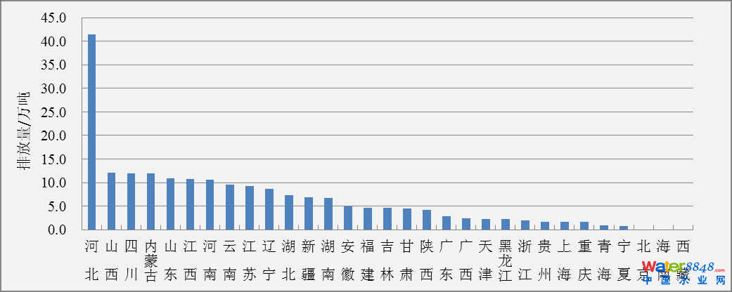 圖3-12 各地區(qū)自備電廠煙(粉)塵排放情況 3.3.3 非金屬礦物制品業(yè)廢氣污染物排放及處理情況 。1)非金屬礦物制品業(yè)總體情況 2013年,非金屬礦物制品業(yè)重點(diǎn)調(diào)查工業(yè)企業(yè)32532家,占重點(diǎn)調(diào)查工業(yè)企業(yè)總數(shù)的22.0%;全年工業(yè)廢氣排放量為120337.2億立方米(標(biāo)態(tài)),占重點(diǎn)調(diào)查統(tǒng)計(jì)工業(yè)企業(yè)廢氣排放量的18.0%;二氧化硫排放量為196.0萬(wàn)噸,占重點(diǎn)調(diào)查統(tǒng)計(jì)工業(yè)企業(yè)排放量的11.6%;氮氧化物排放量為271.6萬(wàn)噸,占全重點(diǎn)調(diào)查統(tǒng)計(jì)工業(yè)企業(yè)排放量的18.5%;煙(粉)塵排放量為258.8萬(wàn)噸,占重點(diǎn)調(diào)查統(tǒng)計(jì)工業(yè)企業(yè)排放量的25.3%。 非金屬礦物制品業(yè)擁有廢氣治理設(shè)施66461套,占重點(diǎn)調(diào)查工業(yè)企業(yè)廢氣治理設(shè)施總數(shù)的28.4%。其中,脫硫設(shè)施數(shù)2051套,占全國(guó)脫硫設(shè)施總數(shù)的9.5%;脫硝設(shè)施數(shù)568套,占重點(diǎn)調(diào)查工業(yè)企業(yè)脫硝設(shè)施總數(shù)的26.4%;除塵設(shè)施數(shù)61393套,占重點(diǎn)調(diào)查工業(yè)企業(yè)除塵設(shè)施總數(shù)的34.1%。二氧化硫去除量為34.1萬(wàn)噸,去除率為14.8%;氮氧化物去除量為29.4萬(wàn)噸,去除率為9.8%;煙(粉)塵去除量為22361.6萬(wàn)噸,去除率為98.9%。 非金屬礦物制品業(yè)二氧化硫排放量居全國(guó)前4位的省份依次為河南、安徽、山東和江西,其二氧化硫排放量占非金屬礦物制品業(yè)排放量的32.2%;氮氧化物排放量居前4位的省份依次為安徽、山東、廣東和河南,其氮氧化物排放量占非金屬礦物制品業(yè)排放量的28.9%;煙(粉)塵排放量居前4位的省份依次為河北、河南、云南和安徽,其煙(粉)塵排放量占非金屬礦物制品業(yè)排放量的28.0%。