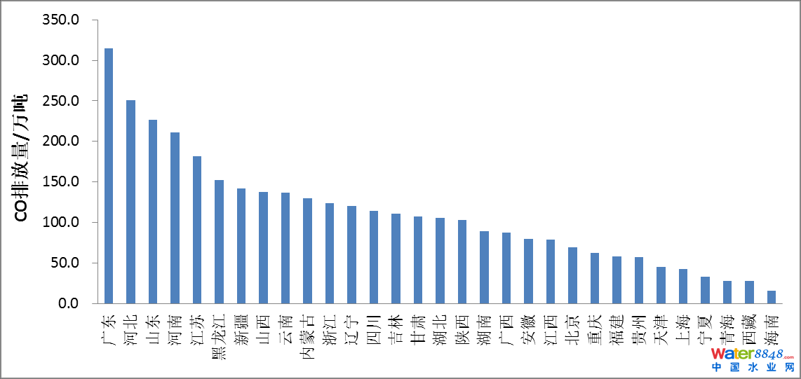 圖3-27 機(jī)動(dòng)車(chē)污染物排放分擔(dān)率 3.5.1一氧化碳(CO)排放情況 2013年全國(guó)機(jī)動(dòng)車(chē)一氧化碳(CO)排放量為3439.7萬(wàn)噸。其中,汽車(chē)排放2912.1萬(wàn)噸,占84.7%;低速汽車(chē)排放14.5萬(wàn)噸,占0.4%;摩托車(chē)排放513.1萬(wàn)噸,占14.9%。 2013年全國(guó)機(jī)動(dòng)車(chē)污染物排放量中,一氧化碳(CO)排放量前五位的省份依次為廣東、河北、山東、河南、江蘇。