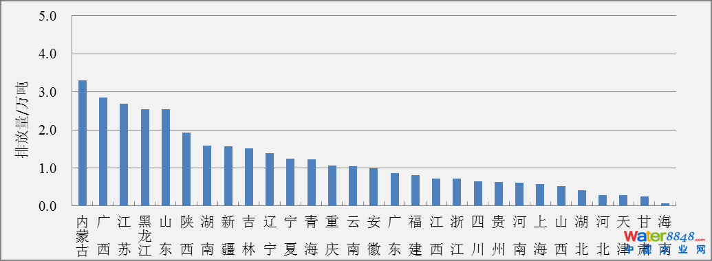 圖3-31 2013年全國(guó)各省份機(jī)動(dòng)車(chē)顆粒物(PM)排放量 |