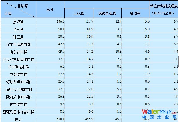 2013年,三區(qū)十群二氧化硫排放量為932.8萬(wàn)噸,其中,工業(yè)二氧化硫排放量為851.7萬(wàn)噸,占三區(qū)十群二氧化硫排放總量的91.3%,城鎮(zhèn)生活二氧化硫排放量為81.0萬(wàn)噸,占三區(qū)十群二氧化硫排放總量的8.7%,集中式二氧化硫排放量為0.1萬(wàn)噸。 三區(qū)十群共有工業(yè)脫硫設(shè)施14185套,占全國(guó)工業(yè)脫硫設(shè)施數(shù)的65.4%,二氧化硫去除率為71.0%。全年工業(yè)二氧化硫去除量為2039.3萬(wàn)噸,占全國(guó)工業(yè)二氧化硫去除量的45.5%。 三區(qū)十群中,二氧化硫排放量居前4位的區(qū)域依次為長(zhǎng)三角地區(qū)、山東城市群、京津冀地區(qū)和成渝城市群,其二氧化硫排放量占三區(qū)十群排放量的66.2%。 三區(qū)十群?jiǎn)挝幻娣e二氧化硫排放強(qiáng)度為7.0噸/平方公里,是全國(guó)平均排放強(qiáng)度(2.1噸/平方公里)的3.3倍。三區(qū)十群中各區(qū)域的單位面積二氧化硫排放強(qiáng)度均高于全國(guó)平均水平。其中,單位面積二氧化硫排放強(qiáng)度較大的區(qū)域?yàn)樯綎|城市群和陜西關(guān)中城市群,其污染物排放強(qiáng)度分別為10.5噸/平方公里和9.0噸/平方公里。二氧化硫排放量和單位面積二氧化硫排放強(qiáng)度均較大的區(qū)域?yàn)殚L(zhǎng)三角地區(qū)、山東城市群和京津冀地區(qū)。