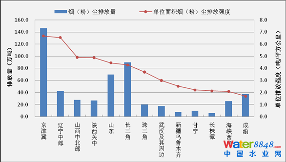 三區(qū)十群共有工業(yè)除塵設(shè)施98326套,占全國(guó)工業(yè)除塵設(shè)施數(shù)的54.6%,煙(粉)塵去除率為98.7%。全年工業(yè)煙(粉)塵去除量為35568.5萬(wàn)噸,占全國(guó)工業(yè)煙(粉)塵去除量的47.5%。 三區(qū)十群中,煙(粉)塵排放量居前4位的區(qū)域依次為京津冀地區(qū)、長(zhǎng)三角地區(qū)、山東城市群和遼寧中部城市群,其煙(粉)塵排放量占三區(qū)十群排放量的66.0%。 三區(qū)十群?jiǎn)挝幻娣e煙(粉)塵排放強(qiáng)度為4.0噸/平方公里,是全國(guó)平均排放強(qiáng)度(1.3噸/平方公里)的3.1倍。三區(qū)十群中各區(qū)域的單位面積煙(粉)塵排放強(qiáng)度均高于全國(guó)平均水平。其中,單位面積煙(粉)塵排放強(qiáng)度較大的區(qū)域?yàn)榫┙蚣降貐^(qū)、遼寧中部城市群、山西中北部城市群和陜西關(guān)中城市群,其污染物排放強(qiáng)度分別為6.7、6.5、4.9和4.9噸/平方公里。煙(粉)塵排放量和單位面積煙(粉)塵排放強(qiáng)度均較大的區(qū)域?yàn)榫┙蚣降貐^(qū)、長(zhǎng)三角地區(qū)和山東城市群。