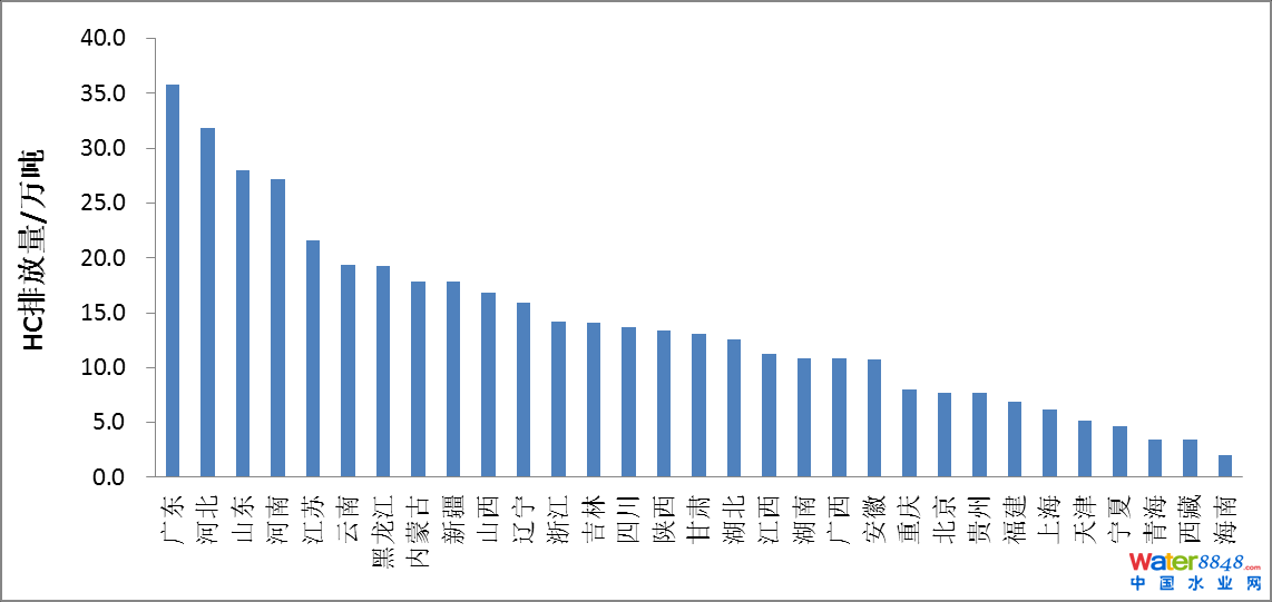 圖3-28 2013年全國(guó)各省份機(jī)動(dòng)車(chē)一氧化碳(CO)排放量 3.5.2碳?xì)浠衔铮℉C)排放情況 2013年全國(guó)機(jī)動(dòng)車(chē)碳?xì)浠衔铮℉C)排放量為431.2萬(wàn)噸。其中,汽車(chē)排放349.0萬(wàn)噸,占80.9%;低速汽車(chē)排放15.8萬(wàn)噸,占3.7%;摩托車(chē)排放66.4萬(wàn)噸,占15.4%。 2013年全國(guó)機(jī)動(dòng)車(chē)污染物排放量中,碳?xì)浠衔铮℉C)排放量前五位的省份依次為廣東、河北、山東、河南、江蘇。