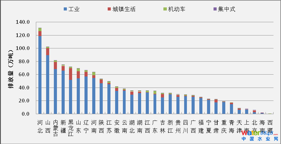 圖3-1 各地區(qū)二氧化硫排放情況 3.2.2 氮氧化物排放情況 2013年,氮氧化物排放量超過(guò)100萬(wàn)噸的省份依次為河北、山東、河南、內(nèi)蒙古、江蘇、廣東和山西,7個(gè)省份氮氧化物排放量占全國(guó)氮氧化物排放總量的44.7%。工業(yè)氮氧化物排放量最大的是山東,城鎮(zhèn)生活氮氧化物排放量最大的是黑龍江,機(jī)動(dòng)車(chē)氮氧化物排放量最大的是河北,集中式污染治理設(shè)施氮氧化物排放量最大的是廣東。