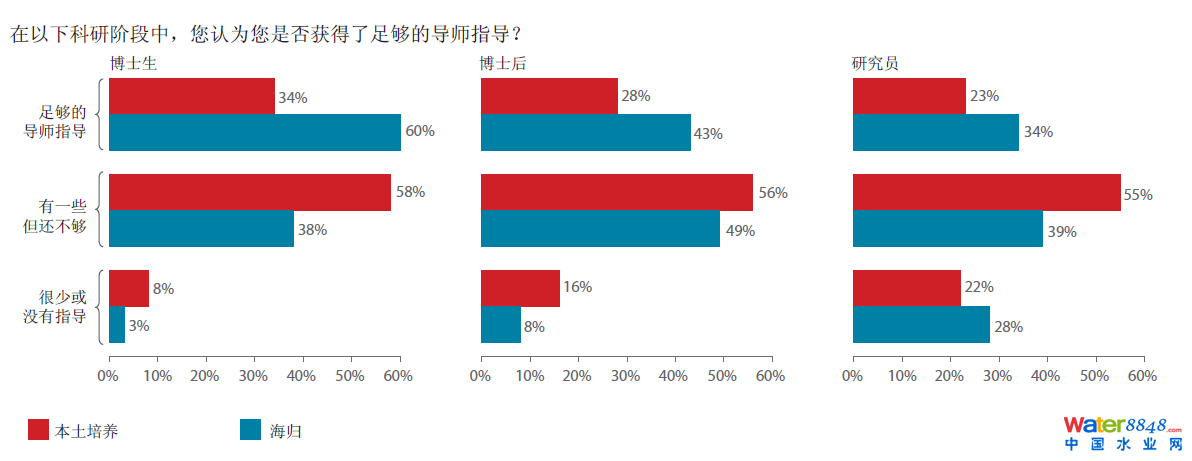 圖4.本土培養(yǎng)的科學(xué)家中有更高比例的人認(rèn)為他們接受的導(dǎo)師指導(dǎo)不夠,包括從博士生、博士后到獨立研究階段