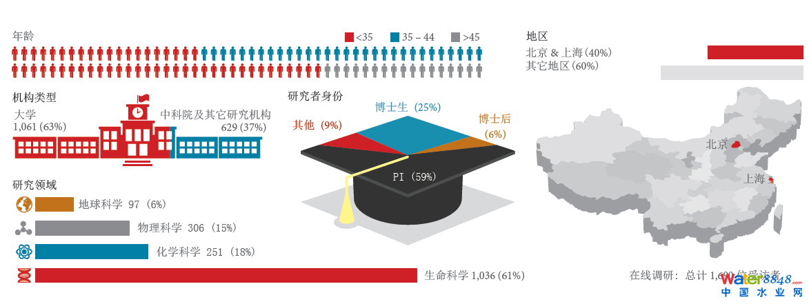 圖1. 我們在線調(diào)研了1690位,代表了中國各個年齡段、研究領(lǐng)域和地區(qū)的科研人員。此外,還訪談了32位PI。