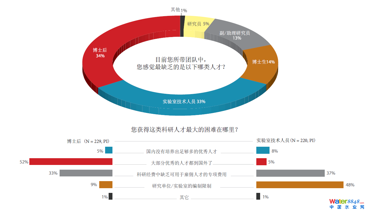 中國有世界上數(shù)量最多的博士生和科技人員。但我們的調(diào)研顯示,許多科學(xué)家卻苦于缺乏博士后研究員和實驗室技術(shù)員(圖6)。這與西方博士后過剩的情況正相反,而他們的許多博士后就來自中國。博士后和技術(shù)人員是中國科研環(huán)境的重要組成部分,尤其是在當(dāng)前的轉(zhuǎn)型時期。有經(jīng)驗的博士后能讓PI更有效地利用時間,還可以在指導(dǎo)年輕學(xué)生和員工方面發(fā)揮關(guān)鍵作用。有能力的技術(shù)人員也日益發(fā)揮著重要的作用,因為越來越多的研究工作中使用的各種復(fù)雜的設(shè)備和技術(shù),需要具備優(yōu)秀專業(yè)技能的技術(shù)人員來有效使用。這些崗位缺少合適的人才,將會影響中國的科研產(chǎn)出,并降低投資回報。那么,中國的科研機構(gòu)如何才能建立一個更為均衡的人力資源結(jié)構(gòu)呢?