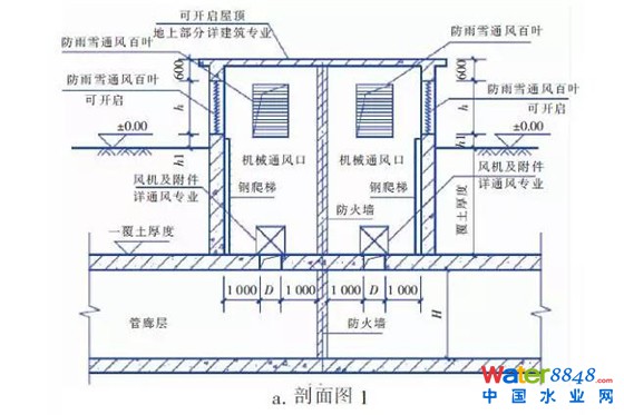 人員出入口指供人員進出管廊的構(gòu)筑物,人員出入口除了要實現(xiàn)人員進出管廊的功能,又不能阻擋廊內(nèi)檢修通道及管線(道)的連續(xù)。由于管廊在道路下的位置及道路的地面情況不同,出入口的地上部分不一定剛好設(shè)置在管廊上方,口部按設(shè)置位置又分成對外口部在管廊投影外部和對外口部在管廊投影內(nèi)部兩種形式。當(dāng)雙艙及以上管廊的幾個艙室共用一個地面口部時,需注意保證不同艙室防火分區(qū)的分隔分成單艙管廊及雙艙管廊人員出入口。圖集規(guī)定了人員出入口處管廊展寬的尺寸要求、轉(zhuǎn)換的凈高要求、樓梯的寬度、防洪、防盜、防火分區(qū)要求等。