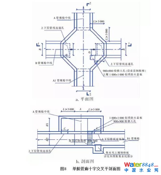 隨著全國推進綜合管廊建設(shè)的力度加大,管廊規(guī)劃的完善,的管廊由原來多沿單條道路敷設(shè),逐漸演變成網(wǎng)絡(luò)狀的布局。當(dāng)兩條道路相交且均布置有綜合管廊時,兩條管廊必然出現(xiàn)交叉,在這個交叉節(jié)點,兩條管廊的通風(fēng)、防火分區(qū)需相互獨立,廊內(nèi)的管線、巡檢人員通行則需相對獨立又相互聯(lián)通。圖集對于交叉節(jié)點的交叉方式、尺寸布置要求、管線連接方式、防火分區(qū)做法等均做了詳細規(guī)定。