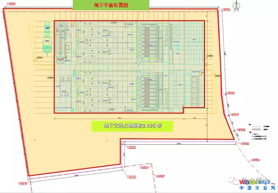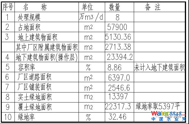 工程為8萬(wàn)噸處理規(guī)模,占地面積5.79公頃,整個(gè)處理廠地下部分地下部分2.66公頃其他為地上部分。整個(gè)處理廠地下部分最深的地方埋深在16米,建好的地下部分,地下廠的上面有一米多的覆土,它的整體地方,整個(gè)廠的綠化率,如果不算廠的部分是32%的綠化率。