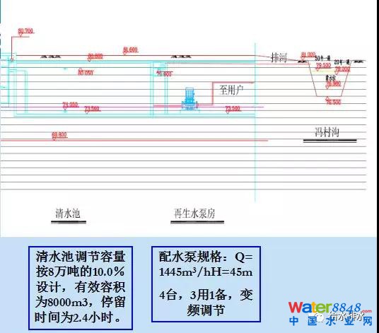 清水池按照8萬(wàn)噸的10%做的設(shè)計(jì),最大停留時(shí)間是2.4小時(shí),后面是配水泵,最終水可以排到村溝。