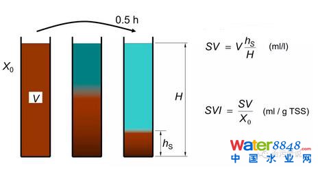 活性污泥的系統(tǒng)是一個由生物池和二次沉淀池共同組成的系統(tǒng)(MBR工藝通過膜分離技術(shù)替代了沉淀池的泥水分離作用),二次沉淀池良好的泥水分離是活性污泥法運行好壞的關(guān)鍵;钚晕勰嗤ㄟ^生物池的曝氣處理后,流入到二沉池內(nèi),在二沉池內(nèi)靜沉沉淀,SV30基本可以代表這個靜沉沉淀的過程。二沉池的沉淀時間往往在2個小時左右,SV30用半小時的時間來代替2小時的沉淀,是因為SV30是在一個靜止的環(huán)境中進行的檢測,而二沉池的2小時沉淀是一個連續(xù)進水連續(xù)出水的環(huán)境,2小時的連續(xù)進出水的沉淀效果和靜止?fàn)顟B(tài)下的30分鐘的效果接近。因此SV30是能夠反應(yīng)出二沉池內(nèi)的泥位高低的一個指標(biāo)。