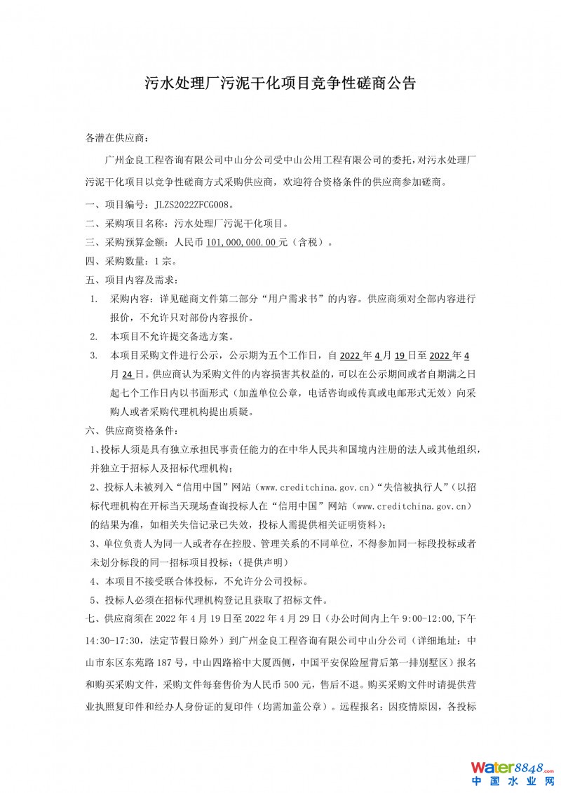 受中山公用事業(yè)集團(tuán)股份有限公司委托:污水處理廠污泥干化項(xiàng)目競爭性磋商公告