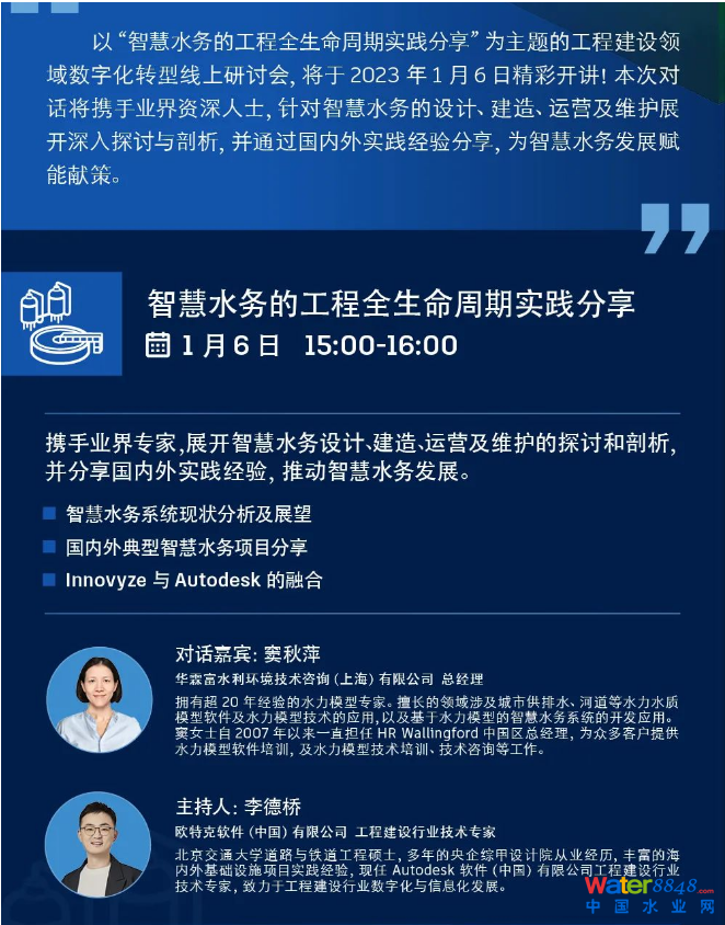 智慧水務(wù)的工程全生命周期實(shí)踐分享為主題的工程建設(shè)領(lǐng)域數(shù)字化轉(zhuǎn)型線上研討會(huì),將于202316日精彩開(kāi)講!本次對(duì)話將攜手業(yè)界資深人士,針對(duì)智慧水務(wù)的設(shè)計(jì)、建造、運(yùn)營(yíng)及維護(hù)展開(kāi)深入探討與剖析,并通過(guò)國(guó)內(nèi)外實(shí)踐經(jīng)驗(yàn)分享,為智慧水務(wù)發(fā)展賦能獻(xiàn)策。