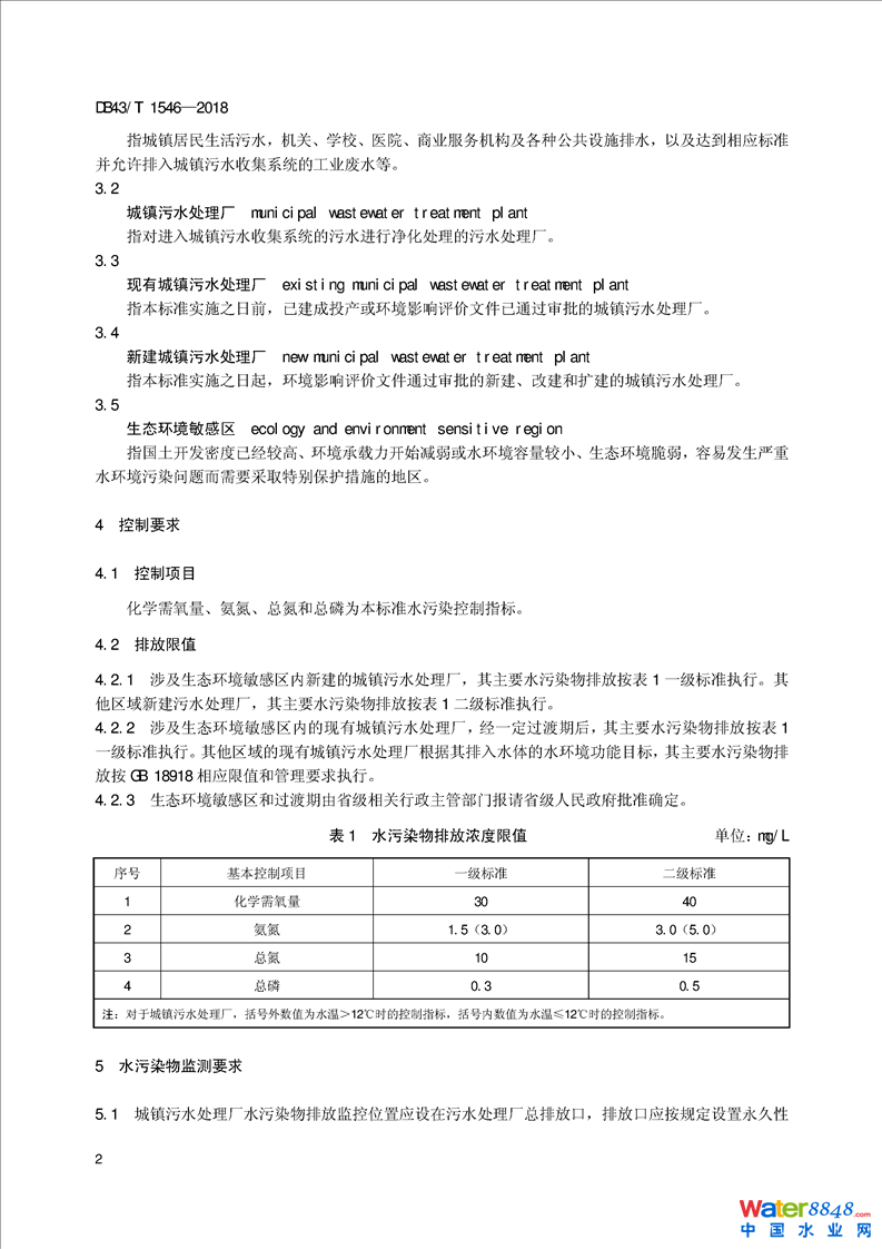 湖南省城鎮(zhèn)污水處理廠主要水污染物排放標準(DB43/T 1546-2018)