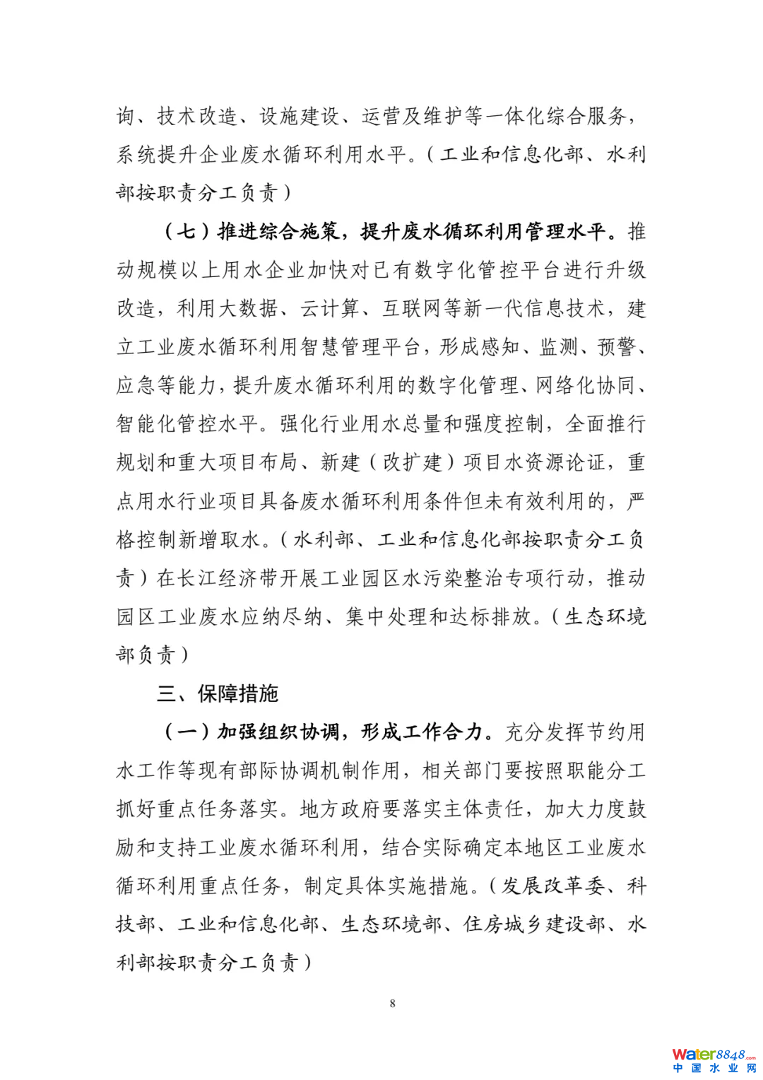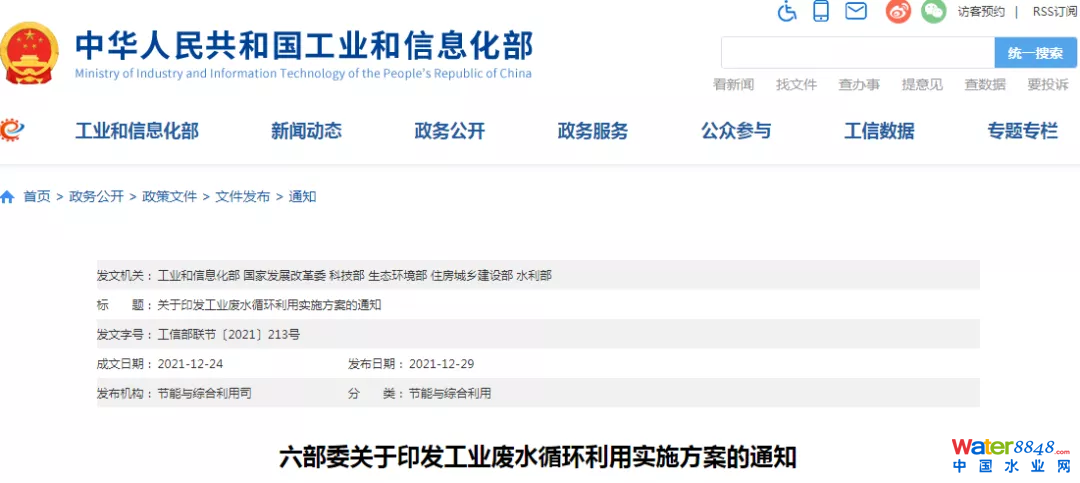 六部委聯(lián)合印發(fā)《工業(yè)廢水循環(huán)利用實(shí)施方案》 工業(yè)和信息化部 發(fā)展改革委 科技部 生態(tài)環(huán)境部 住房城鄉(xiāng)建設(shè)部 水利部