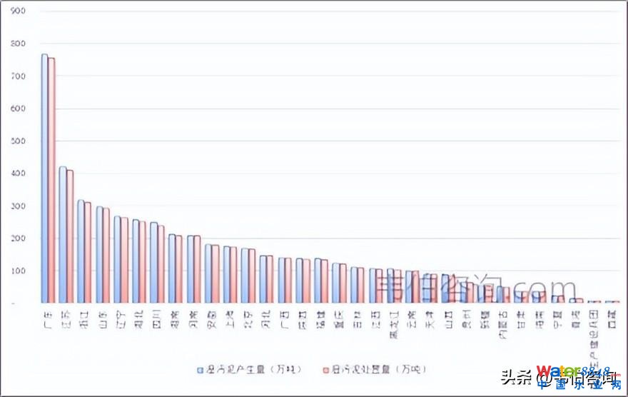從各省污泥產(chǎn)生情況來看:廣東省以766萬噸位列全國第一,江蘇省以421萬噸位列第二,浙江省以316萬噸位列第三。
