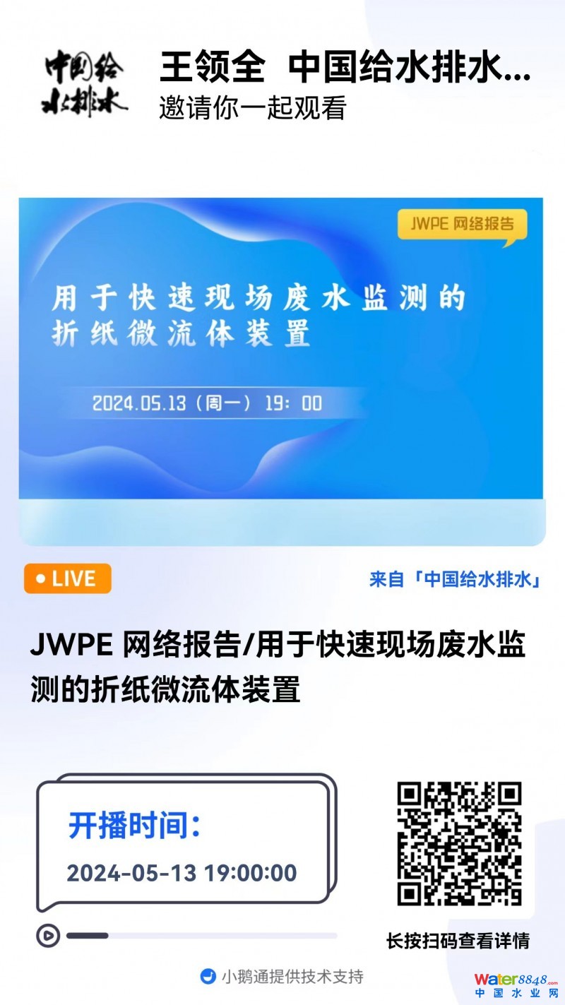 雙碳背景下污泥處置資源化路徑探索--杜炯  教授級高級工程師,上海市政工程設(shè)計研究總院(集團)有限公司第四設(shè)計院總工程師,注冊公用設(shè)備工程師、注冊咨詢工程師(投資),上海土木工程學會會員、復(fù)旦大學資源 JWPE 網(wǎng)絡(luò)報告/用于快速現(xiàn)場廢水監(jiān)測的折紙微流體裝置 直播時間:2024年5月13日(星期一)19:00 2024-05-13 19:00:00 -楊竹根  英國克蘭菲爾德大學教授、高級傳感器實驗