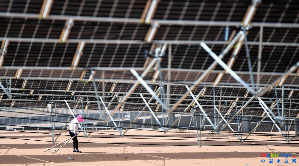 在甘肅省武威市涼州區(qū)九墩灘光伏治沙示范園區(qū),工人在光伏板下作業(yè)(2023 年 5 月 19 日攝) 陳斌攝 / 本刊