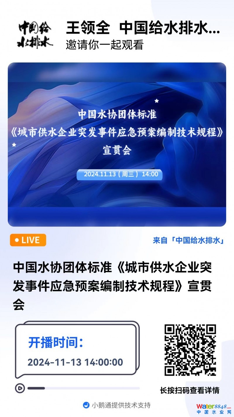 為加強中國水協(xié)團體標準《城市供水企業(yè)突發(fā)事件應(yīng)急預案編制技術(shù)規(guī)程》(編號T/CUWA 20063-2024)的推廣和實施,促進行業(yè)健康、快速、可持續(xù)發(fā)展,我會將協(xié)同標準主編單位山東省城市供排水水質(zhì)監(jiān)測中心與北京市自來水集團有限責任公司于2024年11月13日進行本標準的宣貫直播活動,誠邀廣大業(yè)內(nèi)同仁觀看交流。