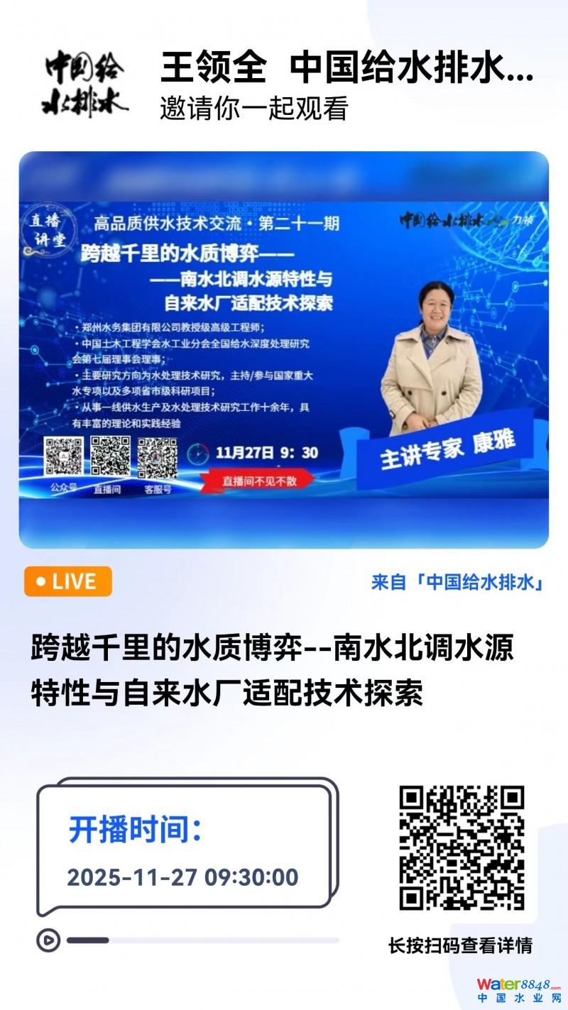 中國(guó)給水排水直播:跨越千里的水質(zhì)博弈--南水北調(diào)水源特性與自來(lái)水廠適配技術(shù)探索 主講人:康雅 鄭州水務(wù)集團(tuán)有限公司教授級(jí)高級(jí)工程師 分析南水北調(diào)通水十年期間給鄭州市供水企業(yè)帶來(lái)的沖擊與挑戰(zhàn),分析原水